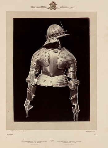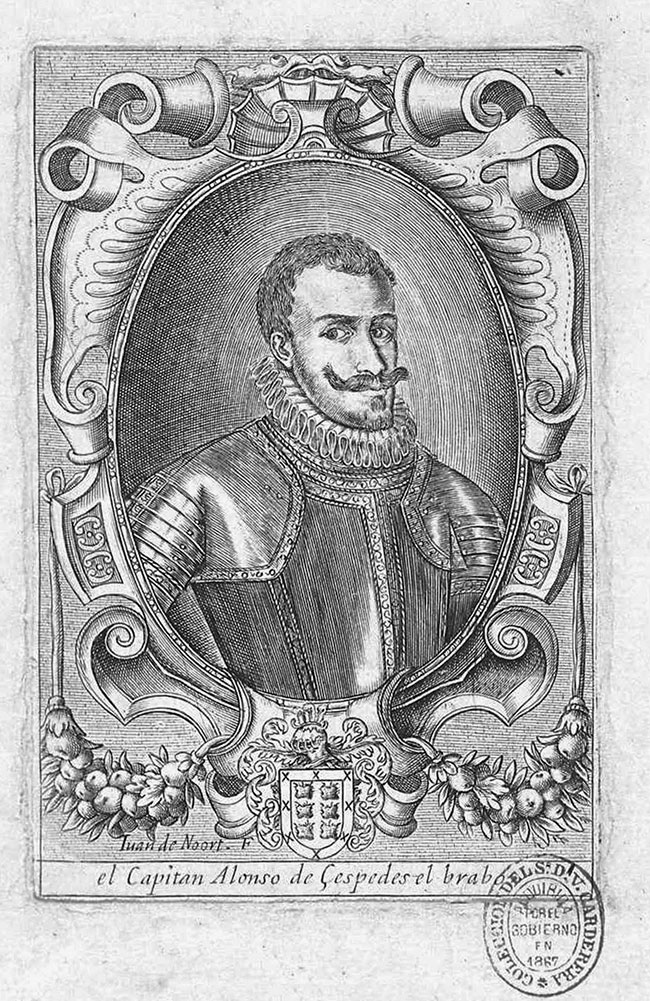 En el grabado de Céspedes de 12’6cm x 8’50 cm se aprecia la figura del militar horcajeño con armadura de la época y debajo su escudo de armas firmado por Juan de Noort, F. Lleva por título "El Capitán Alonso de Céspedes El Brabo”. Apareció por primera vez el año 1647 en “Compendio de las más señaladas hazañas que obro el capitán Alonso de Cespedes Alcides Castellano. Su Ascendencia y Descendencia con varios ramos genealógicos que desta Casa han salido. Publicalo Rodrigo Mendez Silva. Cronista General Destos Reynos de su magestad. Debaxo de la esclarecida protección del Excelentisimo señor Don Luis Mendez de Haro Sotomayor y Guzman Conde-Duque de Olivares Con privilegio en Madrid por Diego Diaz. Año 1647”
